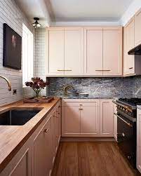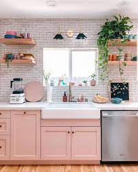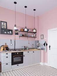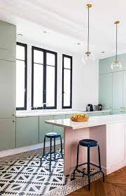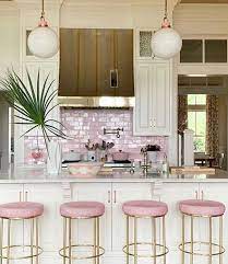Bright green tiles pair nicely with a calming light pink and make for a charming addition to this maximalist kitchen in this classic Buenos Aires home. Paired with pinks of any shade black grounds and balances the energetic happy feel that pink brings to. Kitchen lighting nickel pendant lights blown glass pendant lights.